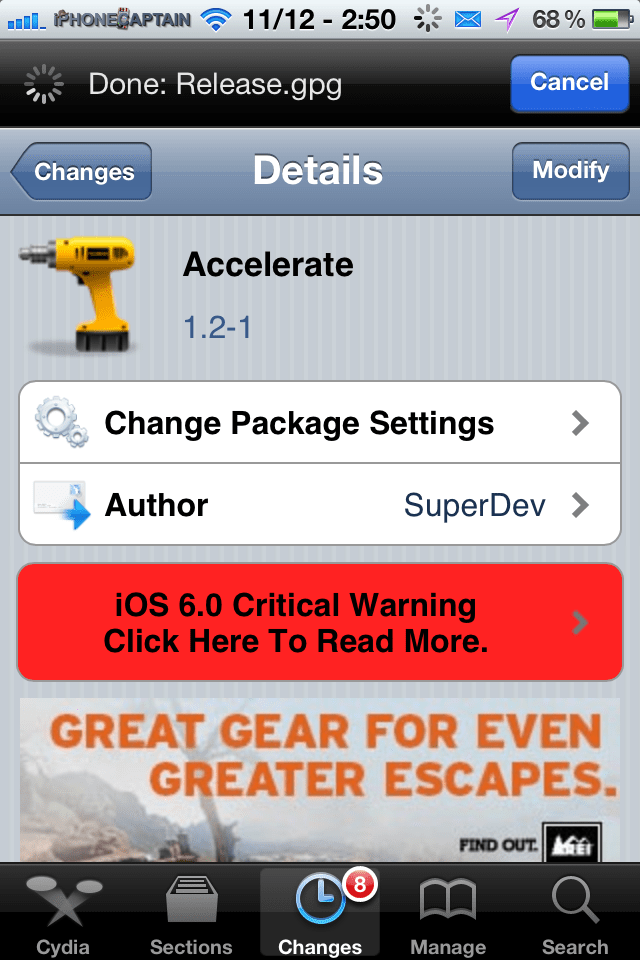 Accelerate is a Free cydia tweak available in BigBoss Repo. The tweak was first released a few weeks ago under the name ClockWind. However, due to all the bugs and problems the developer removed it from Cydia. He now states it has ben rebuilt from scratch and compatible with devices from iPhone 2 to iPhone 4S running firmware iOS 3.x.x to iOS 6.x.x. Choose from several different levels of speed.