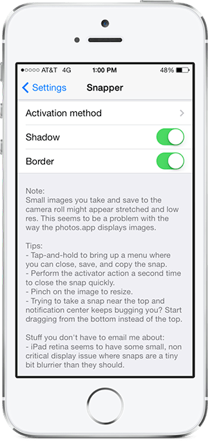 Once you have installed the tweak, you need to go to the stock Setting app to view its preference. For you to activate and use this tweak, the tweak needs assign an activator gesture. Click on the “Activation Method” and choose from the list of gestures which best suits you. Other options are available as to whether to include a “Shadow” and “Border”, again you can select/deselect them as you like. Once all the settings have been configured, its time to take some snapshots.